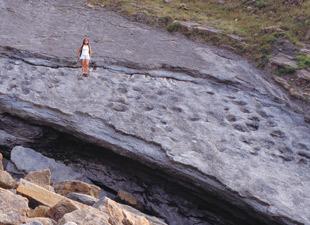 Esta socesión, que s’allarga depués pel cantil escontra l’oeste, amuesa dellos niveles ricos en bivalvos bien pequeños (lumaqueles), amás de resquiebres de desecación y icnites frecuentes de dinosaurios. Estes postreres apaecen na superficie de los estratos como depresiones de contorna ovalada (dinosaurios cuadrúpedos) o bien de traza tridáctila (dinosaurios bípedos).