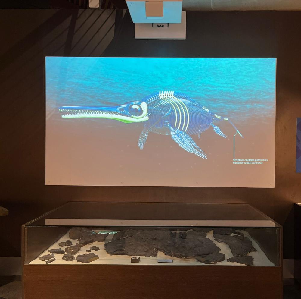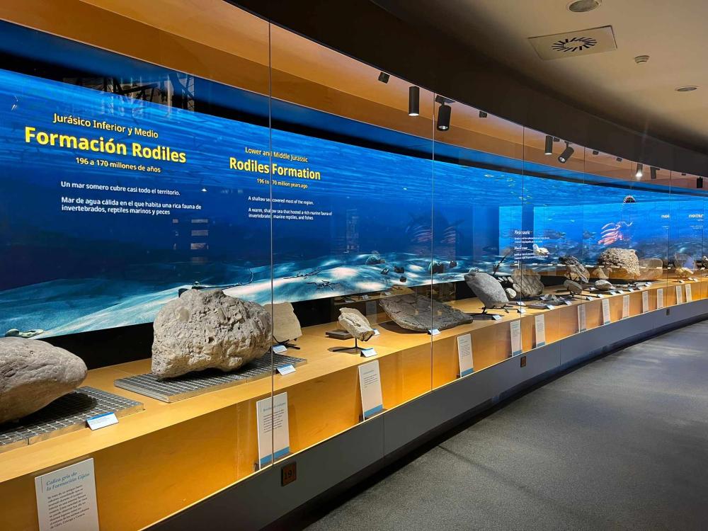 • En la Sala de Introducción al Jurásico, el visitante puede ver cómo se iluminan ciertos huesos del ictiosaurio más completo hallado en la península Ibérica, que se resaltan simultáneamente en una proyección mural para reconstruir el esqueleto completo. A través de una recreación animada, también se muestra el fondo marino en el que habitaba este reptil jurásico y cómo se movía.